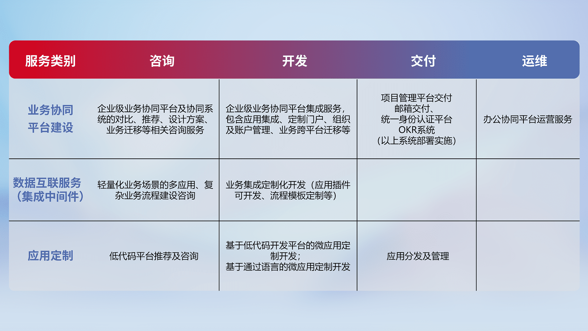 针对钉钉、、、企微、、、IDaas等平台级产品提供产品的规划、、、、方案、、、交付、、、定制化开发等服务,,,实现如统一协同办公、、、智能客户服务、、混合会议管理、、、智能数据查询、、、等业务场景,,,实现数字化转型。。